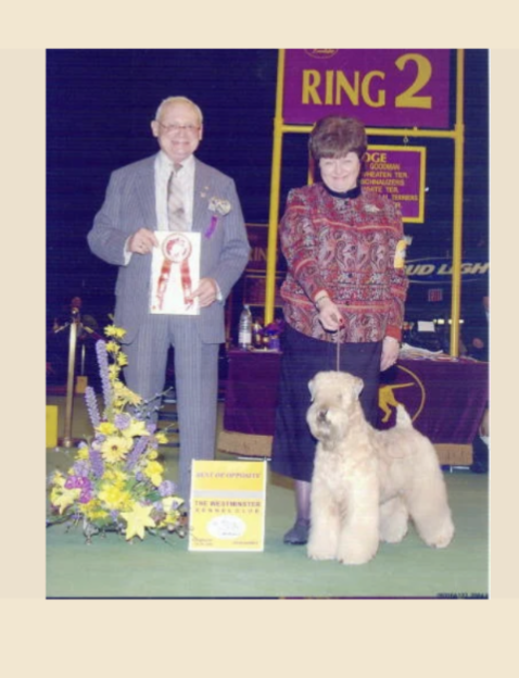 Pam Mandeville showing one of her homebred Soft Coated Wheaten Terriers.