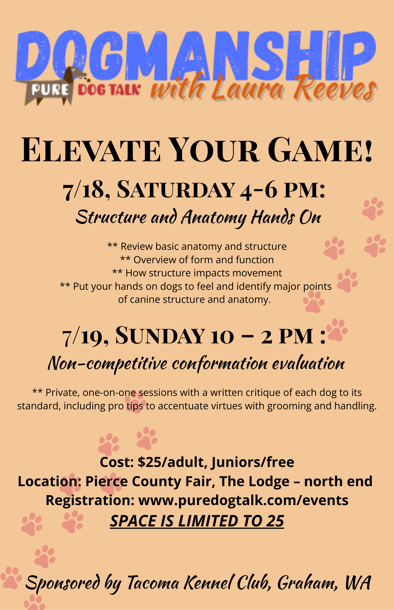Tacoma Kennel Club 21800 Meridian E, Graham, WA, United StatesJoin Laura Reeves and Friends at the Tacoma Kennel Club for an unforgettable hands-on weekend designed to ELEVATE YOUR GAME! We’ll dive into the structure and anatomy of dogs, helping you identify major structural landmarks—and then challenge yourself to do it blindfolded. This workshop isn’t just about mastering technique; it’s about developing the showmanship that…